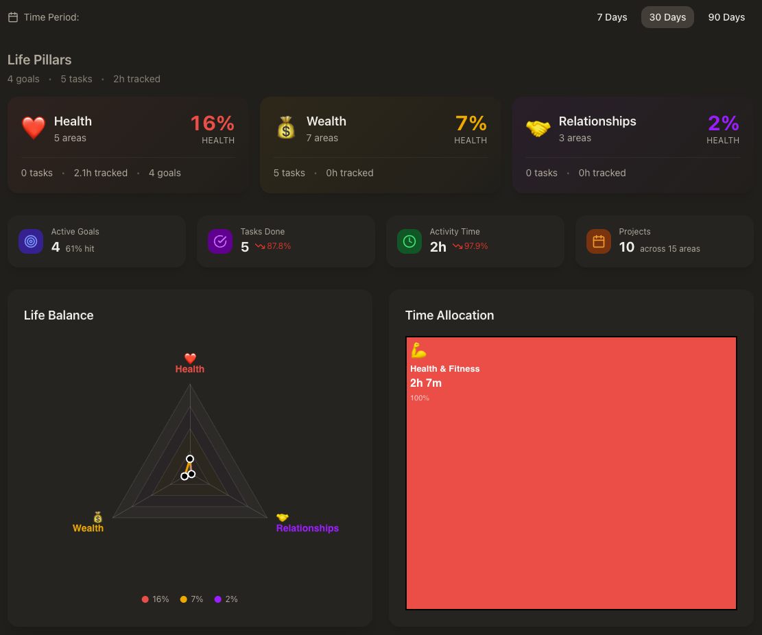 Every goal, project, task, note, and activity belongs to an area. This gives you a top-level view of where your time and energy are going — and where they aren't.