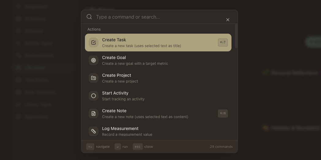 A single shortcut to access every action in the system. Open it with Cmd+Shift+P, start typing, and fuzzy search narrows down the list instantly. Commands are grouped by category — navigation, actions, formatting, wellbeing, and workflows.