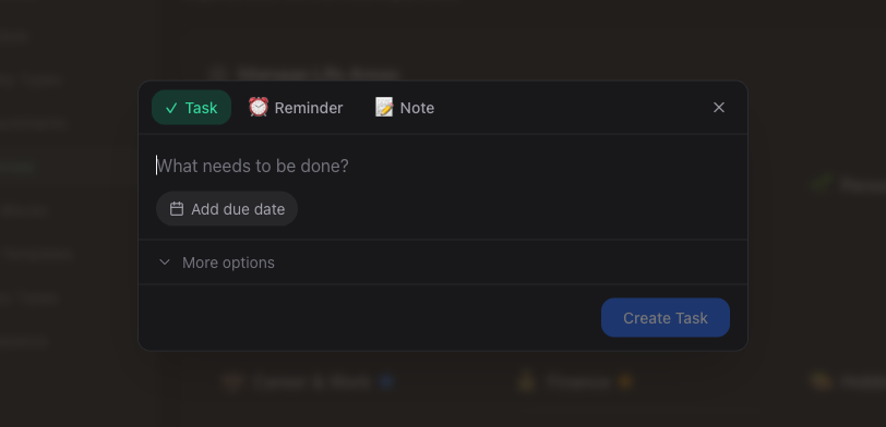 Capture a task, reminder, or note from anywhere in the workspace without navigating to a list first. A lightweight dialog appears with tabs for each type — type what you need, and it's saved. You never have to break your flow to record something.